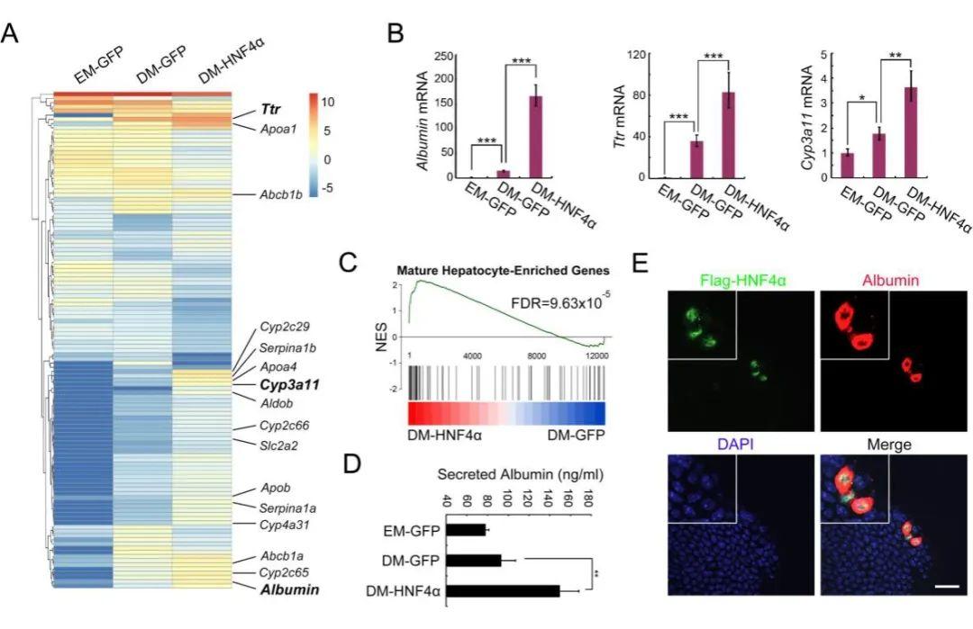 用AAV-DJ-HNF4α(肝细胞核因子4α)或AAV-DJ-GFP转导肝导管类器官,然后进行肝细胞分化诱导。RNA测序显示HNF4α过表达后,肝细胞标记基因Ttr、Cyp3a11(细胞色素P450/CYP450基因,在成熟肝细胞中特异表达)、Albumin(白蛋白)表达上调。表明AAV-DJ-HNF4α极大地促进了肝细胞成熟后的胆管细胞向肝细胞的分化。