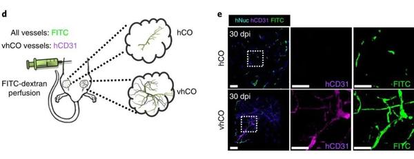 在体外培养的hCOs(人皮层类器官)中异位表达ETV2[ETS(E-twenty six)变型2]转录因子,出现了复杂的功能性血管网络,获得与人血脑屏障十分类似的结构vhCOs(血管化人皮层类器官)。