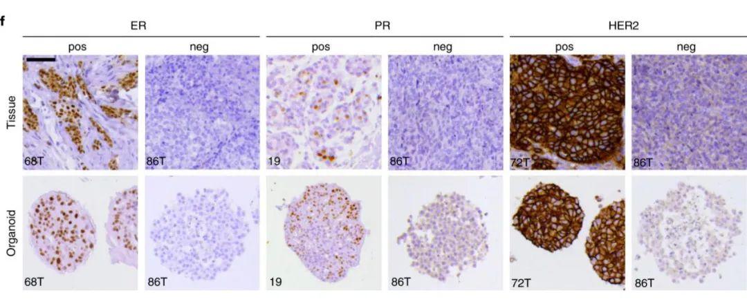 通过免疫组化检测,与原始乳腺肿瘤标本比较发现,类器官在培养过程中有时失去ER(~25%标本,雌激素受体)、PR(~25%标本,孕酮受体)或HER2(~20%标本,人表皮生长因子受体2)表达,少数标本获得ER(~10%)或HER2(<5%标本)表达。