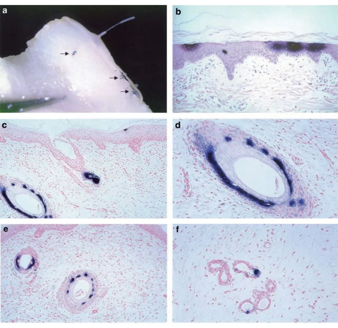 本研究通过对小型猪皮内注射AAV载体,发现AAV不仅存在于分裂和有丝分裂后的表皮角质形成细胞中,也存在于毛囊上皮细胞和外泌汗腺中,这表明AAV有望进一步利用毛囊靶向和通过皮肤对肿瘤或感染因子进行免疫。