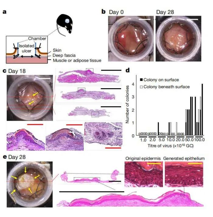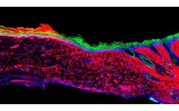 当用AAV递送上述4个因子局部处理小鼠皮肤溃疡时,溃疡处在18天内生长出了健康的皮肤(称之为上皮细胞)。随着时间的推移,即便溃疡面很大,这些上皮细胞也能不断扩大并与周围皮肤连接,并最终覆盖整个溃疡面。3-6个月后,新生成的上皮细胞在多种分子、基因和细胞测试中都表现得如正常皮肤细胞一般。