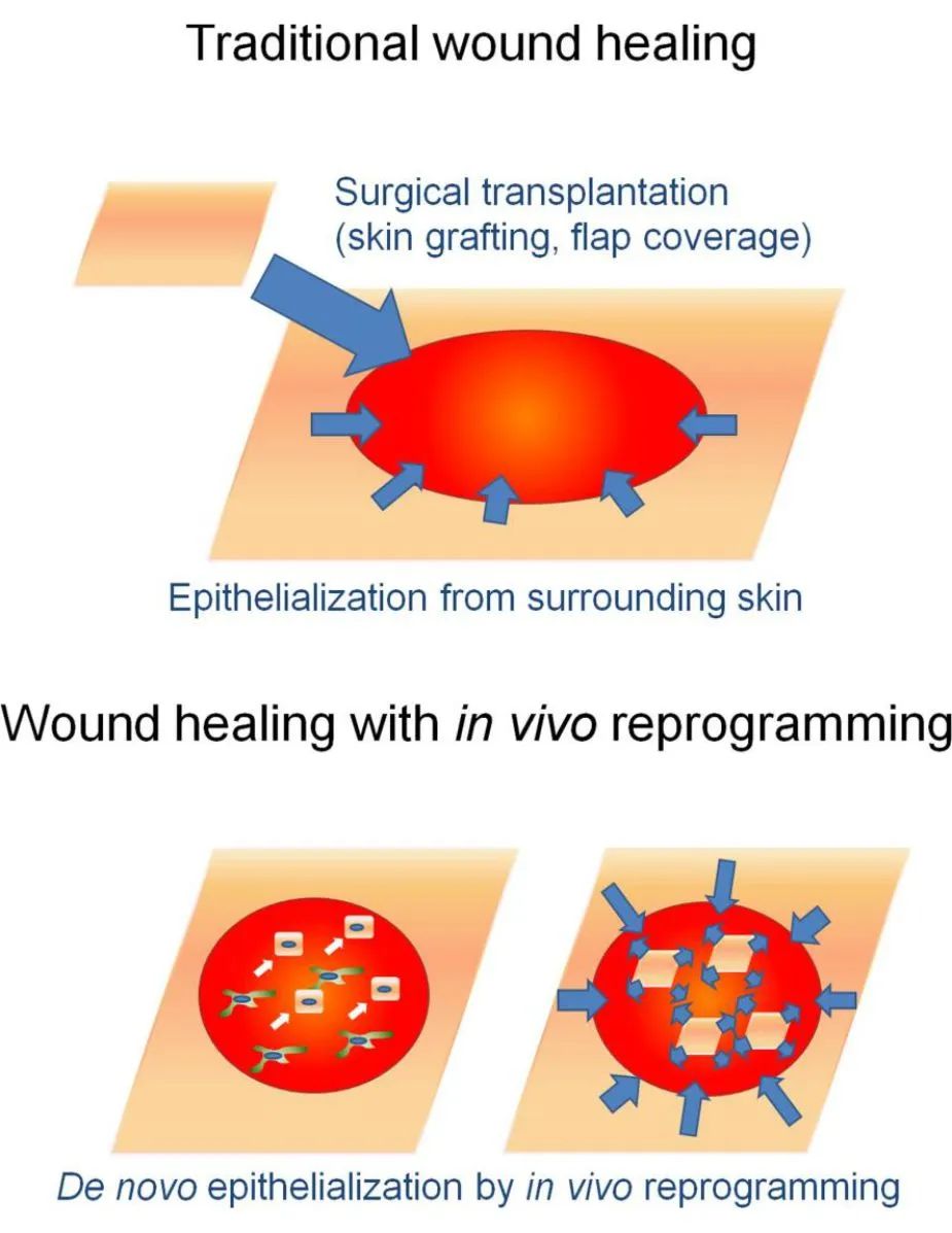 案例二:利用AAV载体将伤口驻留细胞(伤口溃疡处其他细胞)进行重编程成类干细胞,帮助伤口愈合重新长出新皮肤