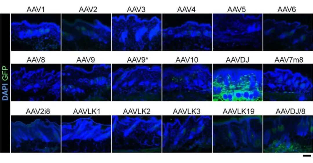 通过在小鼠背部皮肤皮下注射,在CAG启动子下表达eGFP的18种血清型AAV(1E+9GC,100μL),AAVDJ表达的GFP荧光最强[4]。
