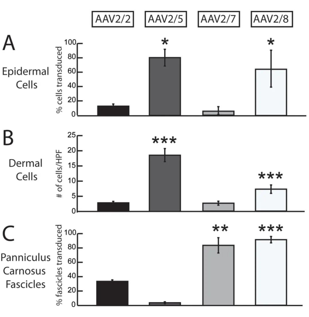 通过构建鼠切除创伤模型,比较AAV2/2和三种假型AAV载体AAV2/5、AAV2/7和AAV2/8对表皮细胞、真皮细胞和肌膜束的转导效率。与AAV2/2相比,AAV2/5和AAV2/8显著增强表皮和真皮中细胞的转导。AAV2/5转导基底和基底上角质形成细胞。相反,AAV2/8主要转导基底上的角质形成细胞。与AAV2/2相比,AAV2/7和AAV2/8在肌膜束中的转导效率较高。