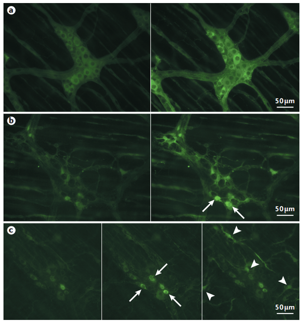 除Wnt1-Cre小鼠外,还有其他Cre驱动的转基因小鼠表达GCaMP3用于肠神经元的研究,包括研究胆碱能神经元的胆碱乙酰转移酶(Chat)-Cre和氮能神经元的神经元型一氧化氮合酶(Nos1/nNOS)-Cre。表达CHAT的肠神经元包括固有感觉神经元、几类下行中间神经元和兴奋性运动神经元。同样,因为一氧化氮作为ENS中一种重要的抑制性神经递质,以及nNOS的产物是由抑制性运动神经元和一类下行中间神经元同时释放,使用nNOS-Cre小鼠也不会驱动单一种类的肠神经元中的基因表达。