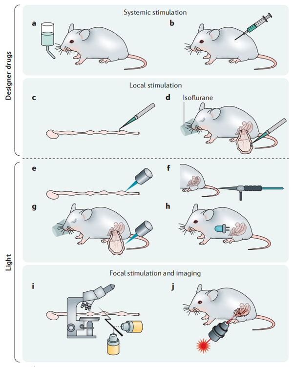除了肠壁中细胞和调控组分外,与中枢神经系统(CNS)的通讯也已通过光遗传学和化学遗传学工具的使用在一些研究中解决。特别是,肠道体液输出对食欲中枢控制的影响以及微生物组对大脑功能的影响已经成为许多调查的主题。一项研究中使用光遗传学刺激生长抑素阳性GABA能神经元(表达ChR2的运动背核迷走神经)后大脑切片显示光刺激抑制了投射到胃窦的运动前神经元。作者使用ArchT小鼠系同样发现使用黄光刺激后可以抑制相同的的神经元群。在小鼠下丘脑弓状核中表达刺鼠相关蛋白(AGRP)的神经元中特异性地表达DREADDs,注射CNO给予刺激,导致小鼠的摄食量明显增加。而在穹窿下器通过脑立体定位注射表达hM3q后,注射CNO给予急性刺激,小鼠饮水量增多,对盐的食欲增加。