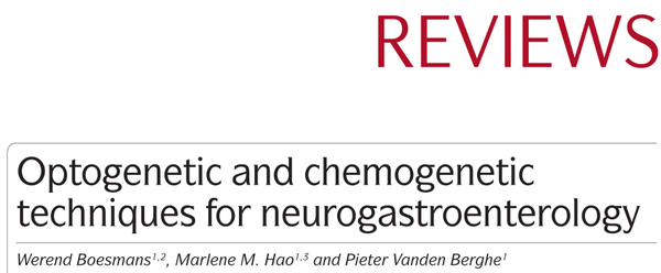 然而,大多数副交感神经支配是传入的,将感觉信息从肠道传递到中枢神经系统。虽然胃肠道的大部分功能还没有被意识到,内脏传入信号可在几种疾病和炎症后条件下发生严重改变,可能导致内脏过敏和疼痛。几十年的研究已经使人们对不同类型胃肠道细胞如何发育、存活和执行功能来协调如胃肠运动,粘膜分泌和营养吸收等行动,有了详细的了解。然而,由于所用实验方法的局限性,关键问题仍未得到解答。实现细胞特异性调控的困难在于空间分辨率差以及缺乏时间控制,这些困难阻碍了对肠道神经回路的组装、神经元-胶质细胞通讯、粘膜感觉、内脏伤害性感受、以及ENS和免疫系统之间的串扰的全面理解。而光遗传学和化学遗传学包括多种应用,其中基因编码工具(如指示器)用于调节和监测具有高度细胞特异性的活动。10年来,这些基因编码工具的开发极大地促进了对综合生理学的理解。随着探针的不断完善,针对特定细胞类型的转基因表达策略在过去的20年里也取得了很大的进步。虽然光遗传学和化学遗传学方法的创新主要由研究中枢神经系统的研究人员推动,但是这些技术对促进神经胃肠病学的研究也有很大的希望。小编在这里给大家推荐Boesmans W等发表在《Nature reviews. Gastroenterology & hepatalogy》题为“Optogenetic and chemogenetic techniques for neurogastroenterology”的综述文章,在这篇综述中,作者描述了当前可用的不同类别的工具,以及概述针对肠壁特定细胞类型的策略。讨论了光遗传学和化学遗传学技术在肠道中的可能性和局限性,并重点关注及概述这两种技术当前在肠神经系统中的用途。