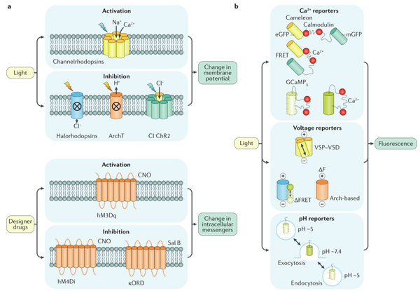 光遗传学通常指基因编码的可以改变神经活动的光激活通道,包括光学激动剂和指示剂。光激动剂可控制细胞中的电化学信号,而光指示剂则用来报告这些信号。相比于传统电生理技术,光指示剂可以检测更大数量的细胞及其相互作用。特别是对于神经元放电过程中细胞内Ca2+浓度变化产生的高信噪比,对Ca2+水平的成像已成为记录神经活动的一种广泛使用的方法。