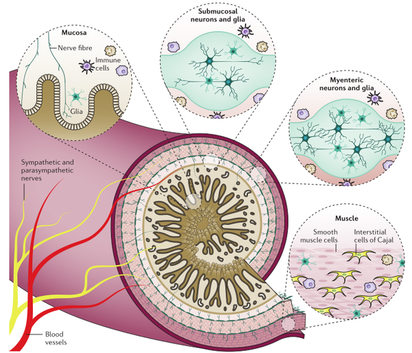 虽然肠道神经系统(ENS)不需要中枢神经系统的输入来执行局部功能,但来自自主神经系统交感神经和副交感神经分支的外源性传出神经,延伸进入肠壁并调节消化功能。