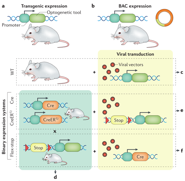 光遗传和化学遗传学的转基因手段可以通过将目的基因插入到细胞特有的“标记基因”的位点中。在确定导入基因的表达时,需要仔细考虑基因整合的具体位点和方法。为了最大限度地减少内源基因表达的中断,转入的基因通常整合到内源基因的最后一个外显子中。内部核糖体进入位点序列(IRES)广泛运用于转入基因的表达,但IRES序列可降低内源性基因的表达。小鼠大脑中,强泛神经元启动子Thy1通常用于基因的过表达。然而,Thy1的表达模式根据插入拷贝数和染色体整合位点的数量而有所不同,导致随机神经元选择。细菌人工染色体(BAC)转基因方法是将目的基因插入到内源性基因的特定位点,在BAC内保存一个大片段的基因组。然后BAC被完全整合到基因组中的一个随机位置,构建出BAC小鼠品系。