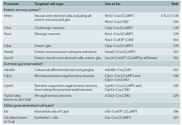 与其他报告或调节细胞活动的方法相比,基因编码探针的关键优势在于可细胞特异性的进行干预。本部分研究关注于对肠道内特定的细胞类型进行光遗传学和化学遗传学的不同策略。
