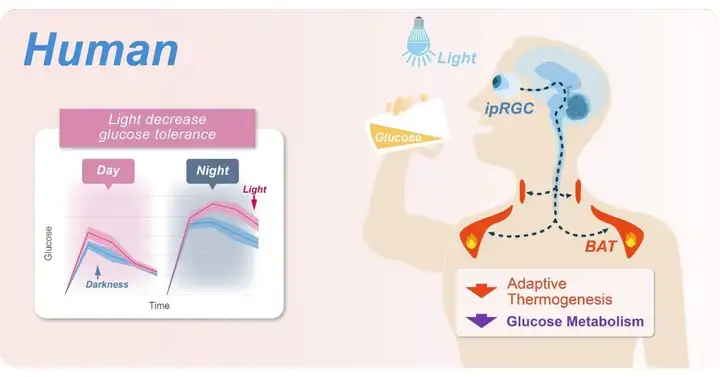 图2:在人上,光可能通过同样的神经环路机制压抑棕色脂肪产热降低血糖耐受性。相较于白天,夜晚人的血糖耐受性更低。