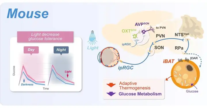 对栖息于这颗蓝色星球上的生命而言,光是一切生命产生的源动力,也是生命体最重要的感知觉输入之一。同时生命体根据外界环境条件控制体内营养物质的代谢平衡是生存的必须,而代谢紊乱会产生严重疾病,哺乳动物已经进化出了精确和复杂的调控网络用于持续动态调控血糖代谢。大量公共卫生调查显示夜间过多光源暴露显著增加肥胖和糖尿病等代谢疾病风险,那么光作为最重要的外部环境因素,其是否直接调控血糖代谢?其中涉及哪类感光的细胞、何种神经环路以及外周靶器官,这些方面的问题一直没有得到解答。