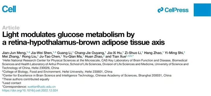 2023年1月20日,中国科学技术大学生命科学与医学部薛天教授研究团队在Cell在线发表题为Light modulates glucose metabolism by a retina-hypothalamus-brown adipose tissue axis的研究成果。该工作发现了光直接通过激活视网膜上特殊的感光细胞,经视神经至下丘脑和延髓的系列神经核团传递信号,最终通过交感神经作用于外周的棕色脂肪组织,直接压抑了机体的血糖代谢能力。值得指出的是,这项工作不但在小鼠动物模型上系统回答了光调节血糖代谢的生物学机理,在人体试验上也发现了同样的现象,显示光调节血糖代谢可能广泛存在于哺乳动物界。