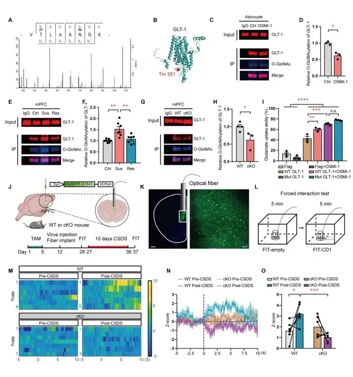 研究者通过O-GlcNAc糖基化修饰组学检测发现,敲除星型胶质细胞的OGT可以使谷氨酸转运蛋白-1(GLT-1)在Thr-551位点的O-GlcNAc糖基化修饰的显著降低,并且通过免疫共沉淀进行了验证。细胞实验进一步验证GLT-1的O-GlcNAc糖基化可以影响GLT-1对谷氨酸的转运能力。为探索GLT-1对应激条件下的谷氨酸代谢的影响,使用谷氨酸探针(iGluSnFR)病毒,分别在CSDS造模前和造模后进行强迫社交行为(Forced interaction test,FIT),并在行为过程中通过光纤记录FIT过程中的谷氨酸变化情况。结果发现CSDS造模前,在FIT实验中,两组小鼠mPFC中神经元的谷氨酸变化无明显差别;而经过10天CSDS后,对照组小鼠谷氨酸信号比进行造模前出现显著升高,然而OGT敲除鼠比对照组表现出更低的谷氨酸信号。结果提示mPFC中星形胶质细胞OGT可以通过GLT-1的O-GlcNAc糖基化修饰,调控社交挫败应激所导致的谷氨酸代谢异常。