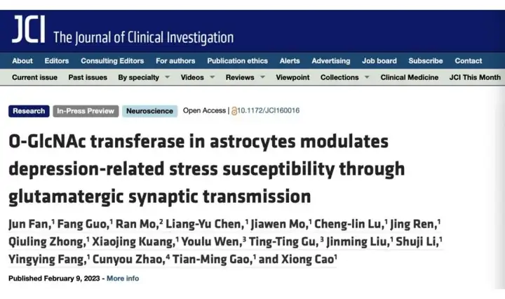 2023年2月9日,曹雄教授课题组在The journal of clinical investigation(IF=19.456)杂志上在线发表了题为“O-GlcNAc transferase in astrocytes modulates depression-related stress susceptibility through glutamatergic synaptic transmission”的论文。该论文揭示了前额叶皮层(mPFC)星型胶质细胞OGT调节谷氨酸转运蛋白(GLT-1)的O-GlcNAc糖基化修饰,参与抑郁发生;通过敲除星型胶质细胞的OGT可改善应激条件下所导致的谷氨酸代谢紊乱,减少锥体神经元的突触损伤,产生抗抑郁的效应。