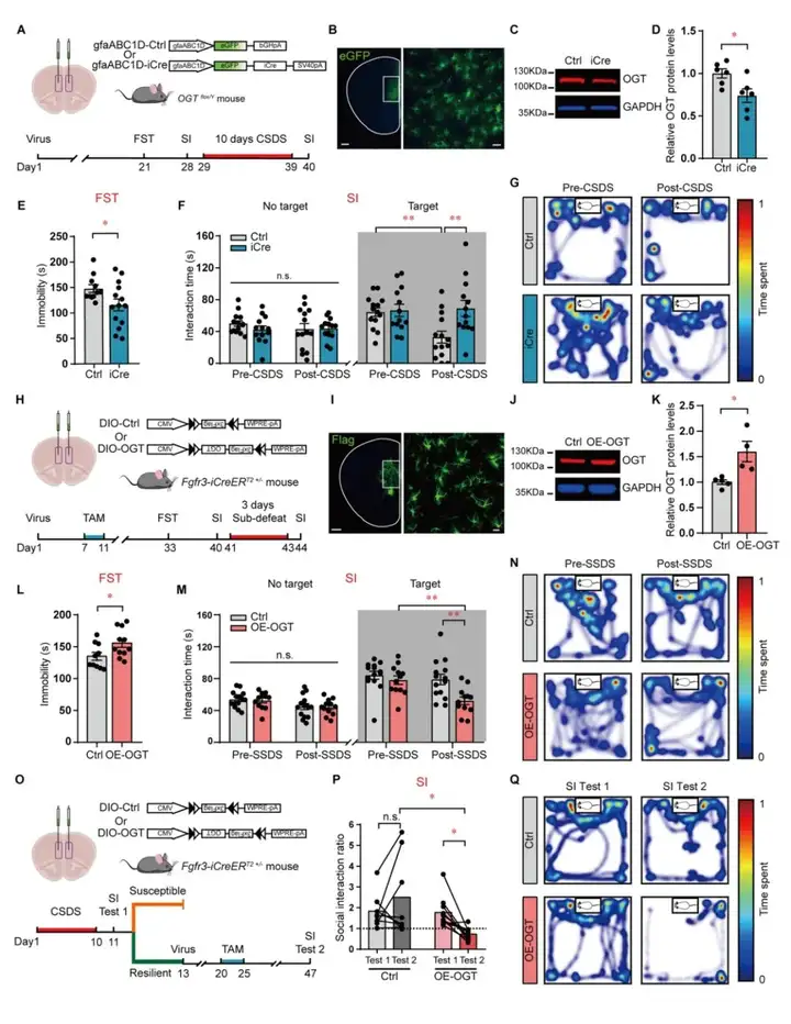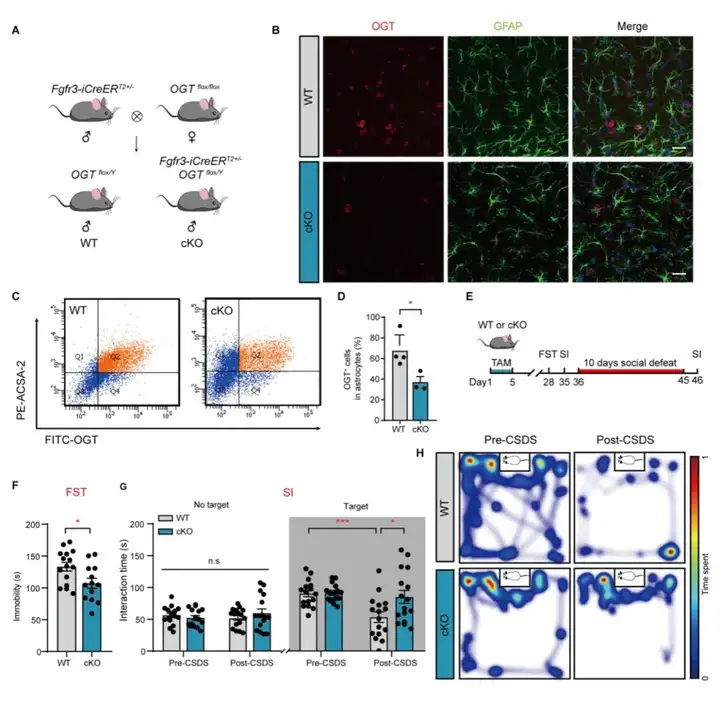 研究者通过Fgfr3-iCreERT2和OGTloxp/loxp获得条件敲除星型胶质细胞OGT小鼠。行为学检测发现在强迫游泳实验(Forced swimming test,FST)中,cKO小鼠表现出更短的不动时间;在CSDS造模后,对照组WT小鼠表现出显著降低的社交时间,然而cKO的小鼠则未发生显著的降低,提示该鼠可以对社交挫败所导致的应激产生抵抗性,具有抗抑郁表型。然而,敲除兴奋性神经元中的OGT则不会出现类似的效应。