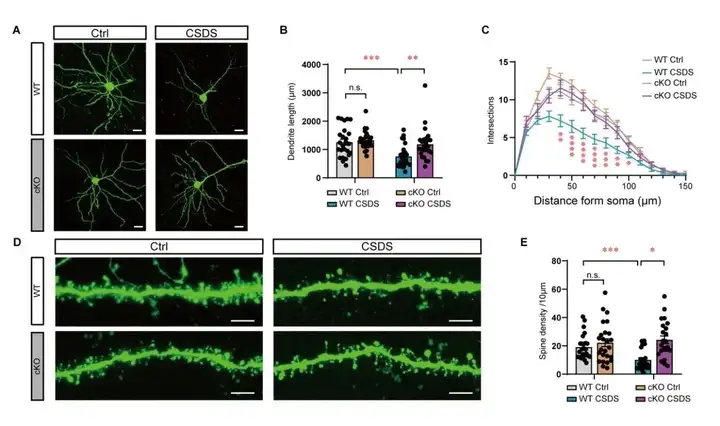 研究者使用rAAV-CamkIIα-FLP和rAAV-nEf1α-FDIO-EYFP(1:1)的混合病毒,对神经元稀疏标记,并进行神经元形态分析。结果显示,经过CSDS造模后,WT组小鼠的树突总长度发生显著的降低,而cKO小鼠则无明显的变化;CSDS后WT组小鼠的树突复杂程度发生了显著的降低,而cKO小鼠则无明显的变化。此外,研究者通过GCaMp6s病毒,在FIT实验中进行光纤钙信号记录神经元钙活动,两组小鼠与CD1鼠社交时神经元的钙信号无明显差别;然而经过10天CSDS后,对照组小鼠比进行造模前神经元钙活动显著降低,然而OGT敲除组小鼠比对照组小鼠表现出明显更高的钙活动。
