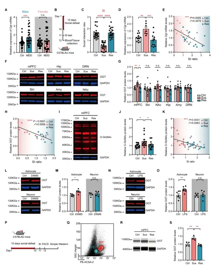 研究者收集了抑郁患者的血液样品,发现男性抑郁患者外周血液中Ogt mRNA水平显著升高。接下来研究者使用抑郁经典模型—慢性社交挫败应激模型(Chronic Social Defeat Stress,CSDS)[5],发现抑郁敏感组小鼠mPFC中的OGT和整体O-GlcNAc水平显著升高,而其他脑区无明显变化。并且通过流式分选和微量Western的技术检测进一步验证,抑郁小鼠mPFC中星型胶质细胞的OGT表达水平特异性增加。