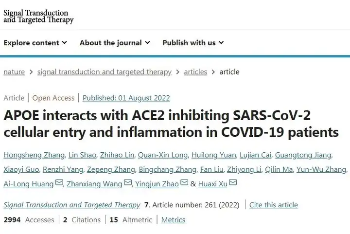 2022年8月1日,厦门大学医学院神经科学研究所许华曦教授、赵颖俊教授联合厦大附属第一医院王占祥主任医师及重庆医科大学黄爱龙教授团队合作在Nature子刊Signal Transduction and Targeted Therapy上发表题为“APOE interacts with ACE2 inhibiting SARS-CoV-2 cellular entry and inflammation in COVID-19 patients”的研究论文,首次发现APOE可以和SARS-CoV-2的ACE2受体结合,进而阻碍SARS-CoV-2上的刺突蛋白(Spike)与ACE2的结合,阻止病毒进入细胞。在这项研究中,研究人员调查了APOE和新冠肺炎患者的免疫反应间的关系,并确定APOE及其亚型如何调节细胞和动物模型中SARS-CoV-2感染。本文中作者发现73名新冠肺炎患者的血清APOE浓度与细胞因子/趋化因子水平呈负相关。利用多种蛋白质相互作用测定,研究人员证明APOE3和APOE4均与SARS-CoV-2受体ACE2相互作用;APOE/ACE2相互作用需要ACE2的锌金属肽酶结构域,而这正是SARS-CoV-2刺突蛋白的关键停泊位点。此外,使用共聚焦、超分辨率的透射电子显微镜的免疫成像分析显示APOE3和APOE4都减少了ACE2/Spike介导的病毒进入细胞。有趣的是,虽然对ACE2具有相当的结合亲和力,但相比于APOE3,APOE4抑制病毒进入细胞的能力较差,这可能是由于APOE4的构象更紧凑,对于Spike竞争性结合ACE2造成的空间障碍更小。此外,在142名评估的新冠肺炎患者中,APOEε4携带者与SARS-CoV-2感染增加、血清炎症因子升高具有临床相关性。总的来说,本研究表明通过APOE与ACE2相互作用的SARS-CoV-2感染的调节机制,并可能部分解释了APOEε4携带者中新冠肺炎感染和疾病严重程度增加的原因,揭示了遗传风险基因调控COVID-19的新机制。