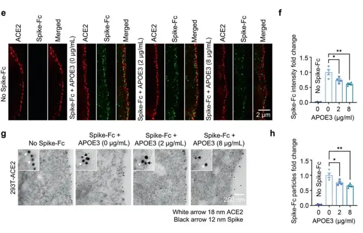 由于SARS-CoV-2是通过病毒的刺突蛋白和ACE2受体结合入侵宿主细胞,那么APOE是否可以和ACE2受体相结合,从而降低SARS-CoV-2的刺突蛋白和ACE2的结合呢?研究人员在293T-ACE2细胞中过表达APOE3-Flag,通过免疫共沉淀实验发现APOE3和ACE2之间存在蛋白质相互作用。进一步使用生物膜层干涉技术证实APOE3和ACE2之间的相互作用。此外,利用免疫电镜观察到重组APOE3处理后293T-ACE2细胞表面APOE3、ACE2和SARS-CoV-2假病毒存在共定位。由于ACE2/Spike结合需要ACE2的锌金属肽酶结构域,作者下一步确定APOE3是否可以调节ACE2介导的刺突蛋白对接到细胞表面,结果表示在培养的293T-ACE2细胞中,APOE3处理显著减少结合到细胞表面的刺突蛋白的量。这些结果表明APOE3与ACE2相互作用,这种相互作用抑制了细胞表面刺突蛋白与ACE2受体的对接。