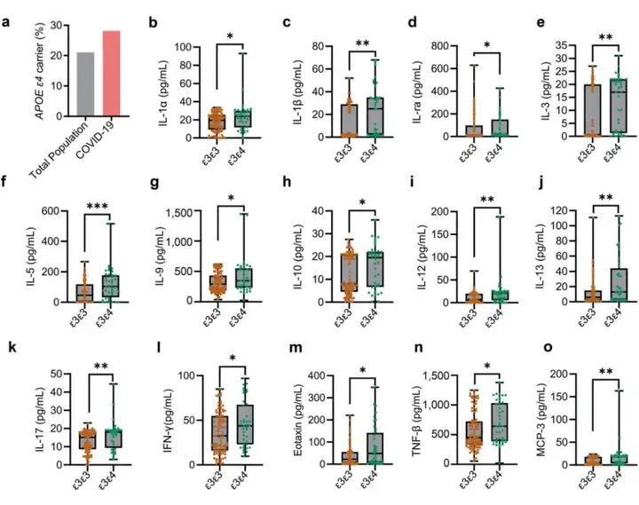 由于APOE3和APOE4不同地影响SARS-CoV-2的感染性,研究人员调查了APOE基因型与新冠肺炎发生率间的相关性,研究COVID-19患者的临床队列。结果显示在不包括APOEε2的142名中国新冠肺炎患者中,71.83%的受试者为APOEε3/ε3(ε3携带者),28.17%的受试者为APOEε3/ε4或ε4/ε4(ε4携带者),而考虑到ε4携带者在中国无痴呆人群(总人口)中的频率为21.10%,本研究显示,ε4携带者的感染率增加了33.51%(28.17 vs.21.10%)。表明APOEε4基因型与COVID-19发病率增加相关。由于新冠肺炎的传染性和严重程度与炎症反应增强相关,作者检测了新冠肺炎患者血清细胞因子/趋化因子的水平。结果表示与APOEε3/ε3携带者比较,APOEε3/ε4携带者中,观察到促炎细胞因子水平升高,包括IL(白介素)-1α、IL-1ra(白介素-1受体拮抗剂)、IL-1β、IL-3、IL-5、IL-9、IL-10、IL-12、IL-13、IL-17、IFN(干扰素)-γ、嗜酸性粒细胞趋化因子、TNF(肿瘤坏死因子)-β和MCP(单核细胞趋化蛋白)-3。综上所述,这些结果清楚地表明,携带ε4等位基因的新冠肺炎患者表现出更严重的炎症反应。