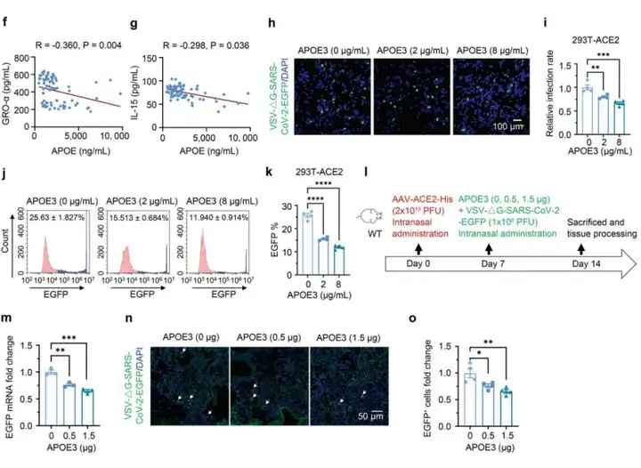 为了研究APOE和SARS-CoV-2诱导的炎症反应的相关性,研究人员对COVID-19患者血清中的APOE、细胞因子和趋化因子进行检测,观察到调整年龄和性别后,血清中APOE的浓度与生长调节α蛋白(GRO-α)、巨噬细胞集落刺激因子(M-CSF)、巨噬细胞迁移抑制因子(MIF)、肿瘤坏死因子相关凋亡诱导配体(TRAIL)、白介素(IL-2、IL-8、IL-15)水平存在显著负相关关系。提示血清中的APOE(尤其是高浓度时)可能会抑制SARS-CoV-2诱导的炎症反应。而SARS-CoV-2诱导的炎症反应与病毒的细胞载量有关,于是研究人员首先评估APOE3(最常见的APOE亚型)对病毒感染的影响。稳定表达人ACE2的HEK-293T细胞(293T-ACE2)加入重组APOE3蛋白培养,利用广泛用于生产SARS-CoV-2假病毒的VSV-ΔG(G蛋白缺失)系统,293T-ACE2中感染PV-SARS-CoV-2-S-VSV-ΔG-EGFP及对照病毒VSV-ΔG-EGFP,24h后共聚焦成像及流式分析,结果显示APOE3处理以剂量依赖的方式降低293T-ACE2细胞中SARS-CoV-2假病毒数量。由于鼻腔给药已广泛用于将野生型和SARS-CoV-2假病毒以及抗体等蛋白质高效输送至呼吸系统,研究人员采用该方法研究APOE3对SARS-CoV-2假病毒转导的影响,鼻内转导表达人ACE2-His(AAV-ACE2-His)腺相关病毒的小鼠模型中,鼻内递送APOE3也剂量依赖性地抑制SARS-CoV-2假病毒感染肺部,这些结果表明APOE蛋白对ACE2/Spike介导的SARS-CoV-2样病毒感染具有保护作用。