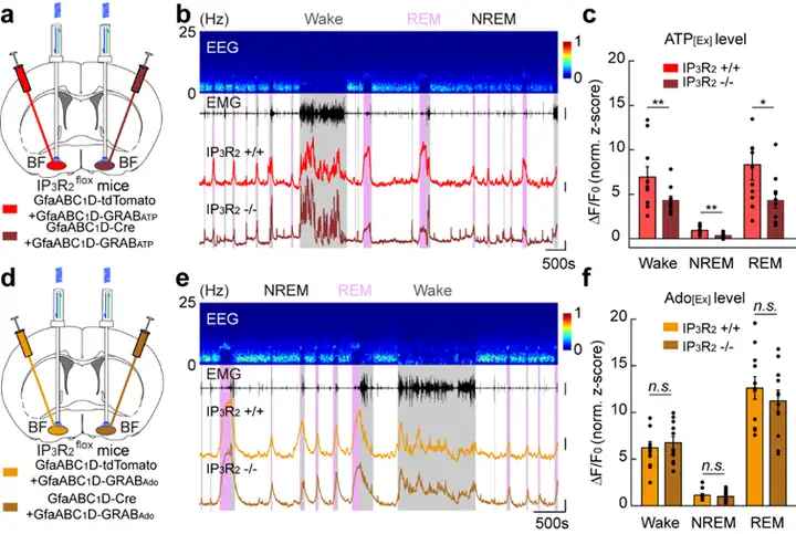既往研究表明,星形胶质细胞可通过腺苷途径参与睡眠-觉醒行为调控。这些研究主要通过在星形胶质细胞中表达dnSNARE,从而抑制其胞吐作用,并结合药理学手段拮抗腺苷受体,间接探究了星形胶质细胞来源的腺苷在睡眠-觉醒行为中的调控作用。然而介导dnSNARE在星形胶质细胞中表达的启动子—胶质纤维酸性蛋白(glial-fibrillary acidic protein,GFAP)启动子,存在外源基因在神经元中异位表达情况。因此,星形胶质细胞在睡眠-觉醒调控中的作用和机制尚未明确。此外,最.新研究表明,睡眠觉醒行为关键调控脑区—基底前脑(basal forebrain, BF)中神经元是胞外腺苷的重要来源(Science,2020)。这也说明星形胶质细胞来源的腺苷只是胞外腺苷的一小部分,进一步提示星形胶质细胞极有可能不通过传统上认为的腺苷通路调控睡眠-觉醒周期。
