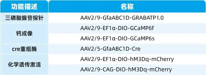 我司可提供光遗传、化学遗传病毒产品,病毒注射及动物实验服务等。部分相关病毒产品列表如下: