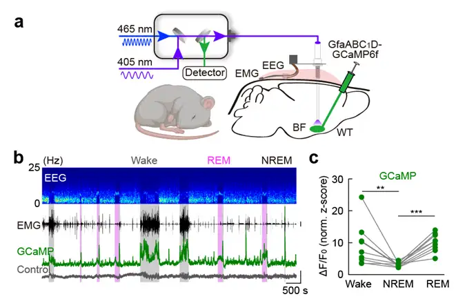 研究人员接下来通过光纤记录探究了BF星形胶质细胞在睡眠-觉醒周期中的活动模式,发现BF星形胶质细胞在觉醒期活跃程度大幅升高(图3),提示它们可能参与了觉醒行为的维持。