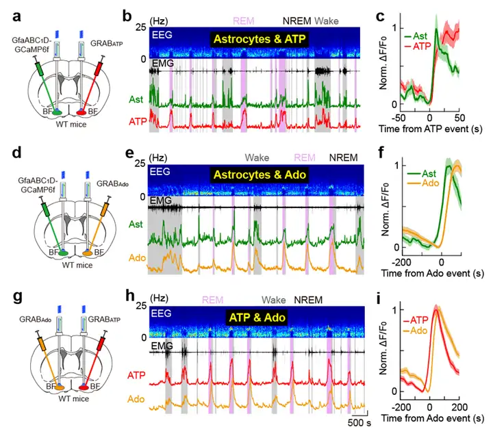 在确定BF星形胶质细胞对睡眠-觉醒周期的调控作用之后,研究人员进一步探究了腺苷信号是否在该过程中发挥了重要作用。既往研究认为,星形胶质细胞首先分泌ATP、ATP再通过一系列胞外酶降解为腺苷。因此,研究人员首先采用北京大学李毓龙教授团队开发的腺苷和ATP探针,测量了星形胶质细胞钙活动与胞外腺苷和ATP之间的相关性。研究发现,星形胶质细胞钙活动与胞外腺苷和ATP信号高度相关,星形胶质细胞钙活动与ATP信号在时程上具有一致性,并且二者均提前于腺苷信号(图5)。以上结果提示星形胶质细胞可能通过释放ATP驱动了胞外腺苷水平的上升。