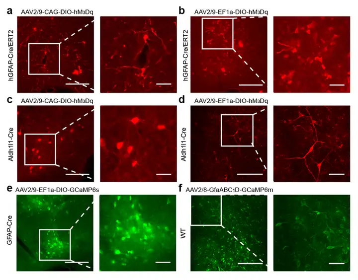 为探究基底前脑星形胶质细胞在睡眠-觉醒调控中的作用和机制,研究人员首先建立了可在BF介导星形胶质细胞特异基因表达的方法。通过系统测试,研究人员发现既往研究采用的多种转基因小鼠或病毒策略均导致严重的漏表达,原本设计为靶向星形胶质细胞的基因却表达神经元中(图1),这种漏表达可能与不同脑区星形胶质细胞的多样性相关;而AAV5+GfaABC1D启动子可在基底前脑介导星形胶质细胞高度特异的基因表达(图2)。