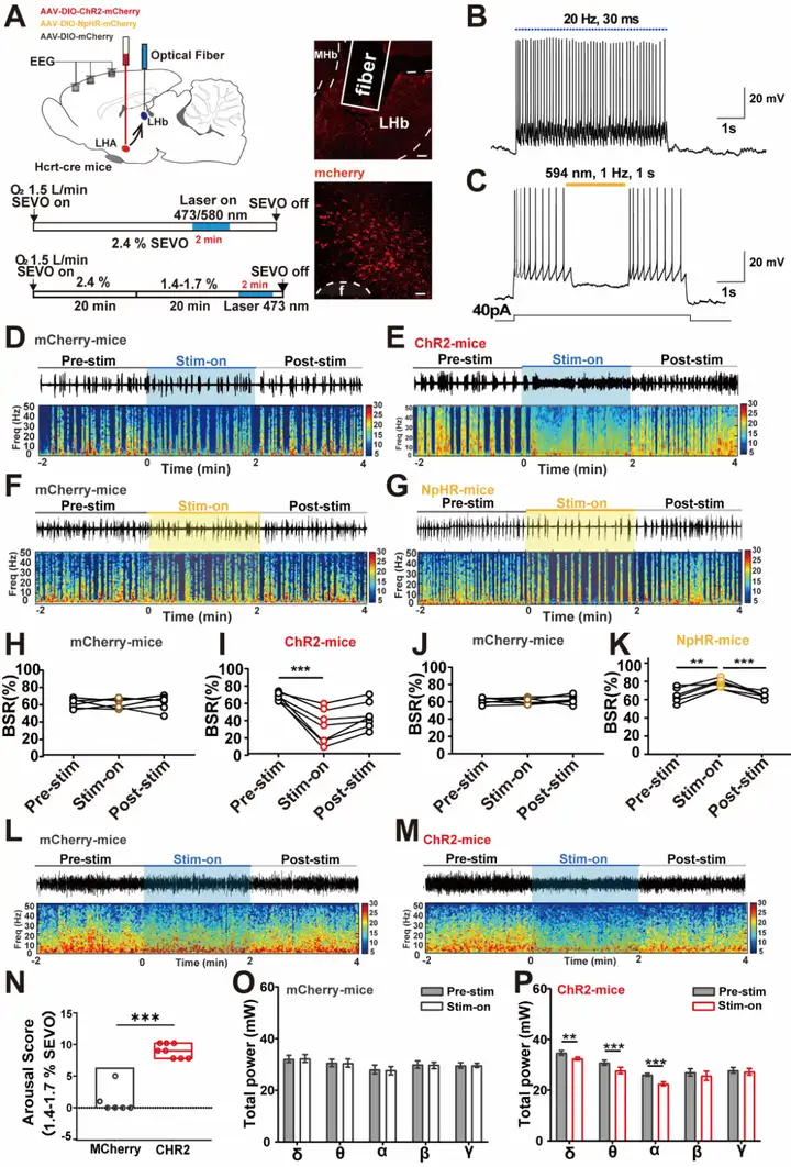 为了明确LHb的Orexin能末梢是否参与麻醉维持,在出现稳定爆发抑制波的深度七氟醚麻醉(2.4%)下(图2A),光遗传激活LHb中Orexin能末梢可将爆发抑制率(BSR)从67.48%显著降低至31.69% (P=0.0006),并在光刺激终止后迅速回到初始状态(图2 E,I)。相反,抑制LHb中Orexin能末梢可将爆发抑制率(BSR)从67.48%升到77.54%(P=0.0081),同样没有后遗效应(图2 G、K)。 在七氟醚浅麻醉过程中(1.4-1.7%),激活LHb中Orexin能末梢可迅速诱导类清醒样行为,表现包括腿、头和胡须的运动,甚至直立和行走,将行为进行量化分析后,行为唤醒总分远高于对照组(P<0.001)(图2N)。同时,光遗传激活LHb中Orexin能末梢可显著降低小鼠脑电麻醉深度(图2M),表现为脑电δ波功率、θ波功率和α波功率(图2P)的显著降低。停止激光刺激后,脑电频谱特征逐渐恢复。上述结果均提示:orexinergicLHA-LHb投射在麻醉维持期及觉醒期均有显著的促觉醒效应。