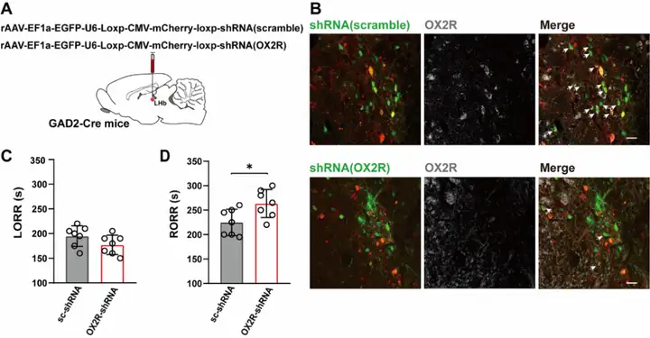 既往研究发现LHb中,GAD2阳性的GABA能神经元选择性高表达OxR2。因此,研究应用GAD2-Cre小鼠结合RNA干扰技术选择性敲低LHb区GABA能神经元上的OxR2。在成功敲低LHb区GABA能神经元的OxR2后(图5B),可显著延长麻醉觉醒时间(图5D)但并不改变平均诱导时间(图5C)。应用相同的策略下调了vGlut2-Cre小鼠LHb谷氨酸神经元上的OxR2表达则不影响麻醉诱导或觉醒过程。结果提示orexin可能通过作用于LHb区GABA能神经元上的OxR2受体发挥促觉醒作用。