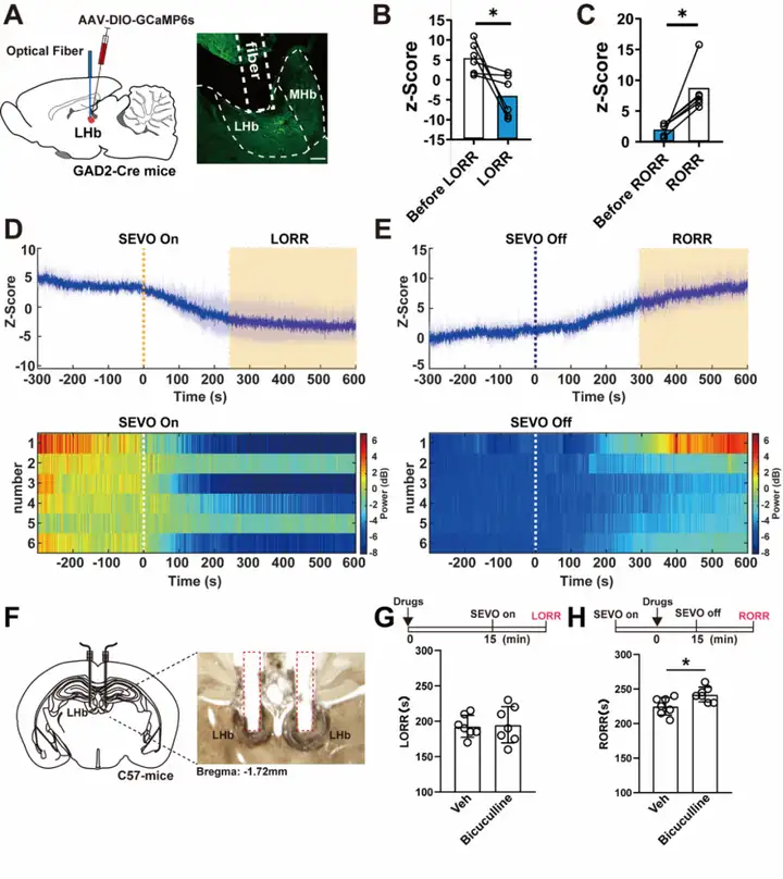 为了验证上述发现,我们应用GAD2-Cre小鼠结合钙成像技术,进一步研究七氟醚麻醉过程中LHb区GABA能神经元兴奋性变化特征(图6A)。结果显示,七氟醚麻醉开始后,LHb区GABA能神经元钙信号逐渐下降(图6B, D),并在麻醉停止后缓慢恢复(图6C, E),这一变化特征与七氟醚麻醉下Orexin能神经元的兴奋性动态变化一致。由于在LHb绝大多数神经元为谷氨酸神经元,那么在麻醉觉醒期被orexin激活的LHb区GABA神经元是否通过局部作用于谷氨酸神经元来发挥促觉醒作用呢?作者采用药理学方法阻断LHb的GABA受体,发现能够显著延长麻醉苏醒时间,提示LHb区GABA神经元-谷氨酸神经元微环路参与orexin促麻醉觉醒的可能性。