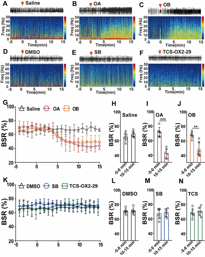 进一步研究显示,在麻醉维持期LHb微注射OA(图4I)和OB(图4J)均可显著减少爆发抑制波的数量,且BSR下降至少持续15分钟(图4G)。但SB334867和TCS-OX2-29微注射均未改变脑电图谱(图4K-N)。