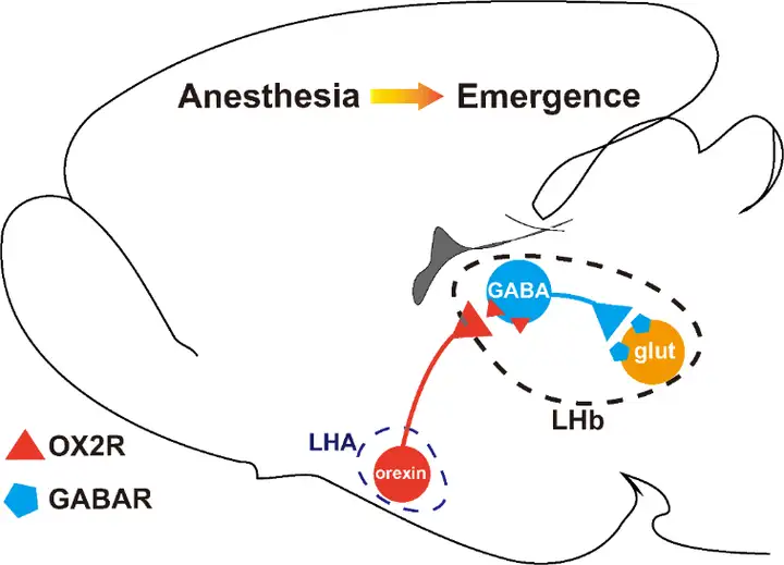 综上所述,该研究应用模式动物、化学遗传学、光遗传学、药理学调控及RNA干扰技术等,揭示了LHA区Orexin能神经元通过OxR2调控LHb区GABA能神经元发挥促麻醉后觉醒的作用,并初步发现这一作用可能通过支配LHb局部谷氨酸神经元的微环路介导的(图7)。该研究为进一步理解Orexin能促觉醒系统在全麻过程中的环路机制提供了重要的实验依据,也为理解觉醒神经网络间兴奋性与抑制性环路的交联机制提供例证基础。