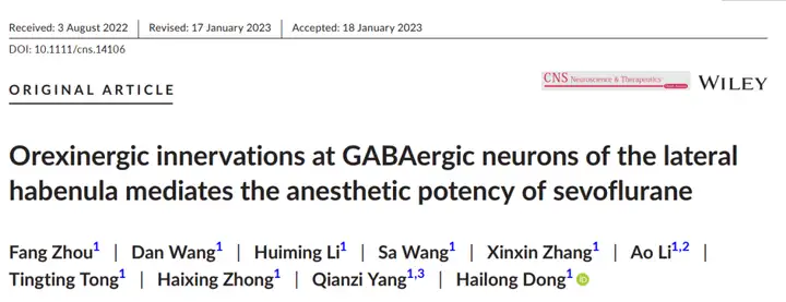 2023年2月5日,空军军医大学西京医院麻醉与围术期医学科董海龙教授团队在CNS Neuroscience & Therapeutics(CNSNT)上发表了题为“Orexinergic innervations at GABAergic neurons of the lateral habenula mediates the anesthetic potency of sevoflurane”的文章,阐述了Orexin能神经元通过支配LHb的GABA能神经元促进麻醉觉醒的新机制。