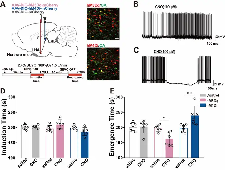 为了证实LHb中Orexin能末梢是否参与七氟醚麻醉的效应,研究首先应用了Hcrt-cre小鼠结合化学遗传学调控orexinergicLHA-LHb投射。结果发现,激活OrexinergicLHA-LHb投射可以显著缩短2.4% 七氟醚麻醉的苏醒时间(图1E);而抑制该投射同样显著延长了麻醉苏醒时间(图1E)。然而,激活或抑制orexinergicLHA-LHB投射都对麻醉诱导没有明显影响(图1D)。