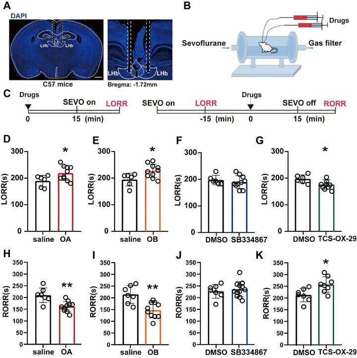 图3 LHb的Orexin-A/B和OxR2参与了七氟醚麻醉过程的诱导和觉醒(图源:Zhou F, et al., CNSNT. 2023)