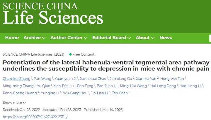 2023年3月14日,Science China Life Sciences杂志(IF=10.372)在线发表了陈涛(空军军医大学)教授、李金莲(西北大学)教授、侯武刚(空军军医大学)教授及李云庆(空军军医大学)教授联合通讯的研究论文“Potentiation of the lateral habenula-ventral tegmental area pathway underlines the susceptibility to depression in mice with chronic pain”。该研究首次揭示了慢性神经病理性痛导致抑郁易感和抵抗的环路和突触机制。