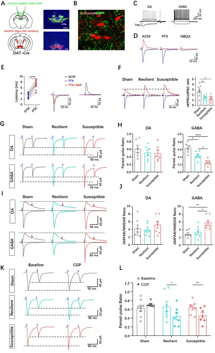 通过将兴奋性光敏蛋白ChR2表达于LHb-VTA的投射通路,作者进一步研究了慢性痛之后VTA内神经元受到的LHb投射的影响。结果表明,LHb向VTA内的多巴胺(DA)和g-氨基丁.酸(GABA)能神经元均发出直接的谷氨酸能兴奋性单突触投射。慢性痛之后,LHb-GABAVTA的突触传递增强,且较于抑郁抵抗的小鼠,抑郁易感小鼠LHb-GABAVTA的突触传递更强,然而,相较于假手术组小鼠,无论是抑郁易感还是抑郁抵抗小鼠的LHb-DAVTA的投射均未增强。进一步研究表明,GABAVTA神经元通过突触后GABAA受体抑制了DAVTA神经元的活性,并且通过突触前GABAB受体清除了慢性痛之后LHb对于DAVTA神经元增强的输出效应(图3)。综合而言,慢性痛之后,LHb增强了GABAVTA神经元活性,进一步导致了DAVTA神经元活性下降,而这种现象在抑郁易感小鼠更为显著。