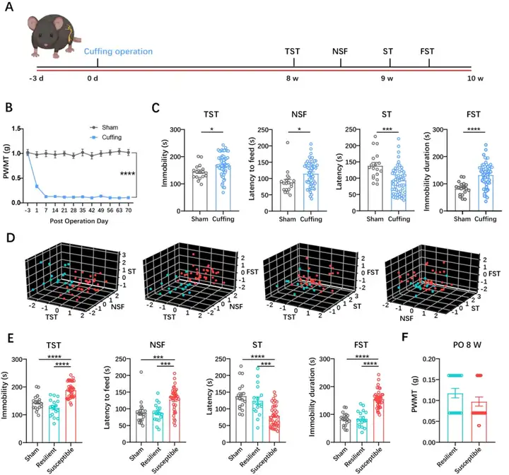 鉴于常见的神经病理性痛模型往往存在疼痛程度不确定,疼痛持续时间不足,难以稳定诱导抑郁行为的缺点,作者通过在小鼠左侧坐骨神经干上放置PE套管,建立起坐骨神经长期刺激的慢性神经病理性痛模型,该模型小鼠的疼痛行为稳定表达8周以上。手术8周后,序列测定小鼠在悬尾(TST),新环境进食抑制(NSF),溅水(ST)以及强迫游泳(FST)行为中的抑郁表现,发现大部分小鼠出现程度不同的抑郁表型。为了进一步区分小鼠可能的抑郁抵抗效应,作者通过无监督的K-means算法综合了四种不同的抑郁范式测量结果,证实将近70%的慢性痛小鼠为抑郁易感小鼠,而30%的慢性痛小鼠为抑郁抵抗小鼠(图1),该比率与临床慢性应激患者出现抑郁的比率相一致。