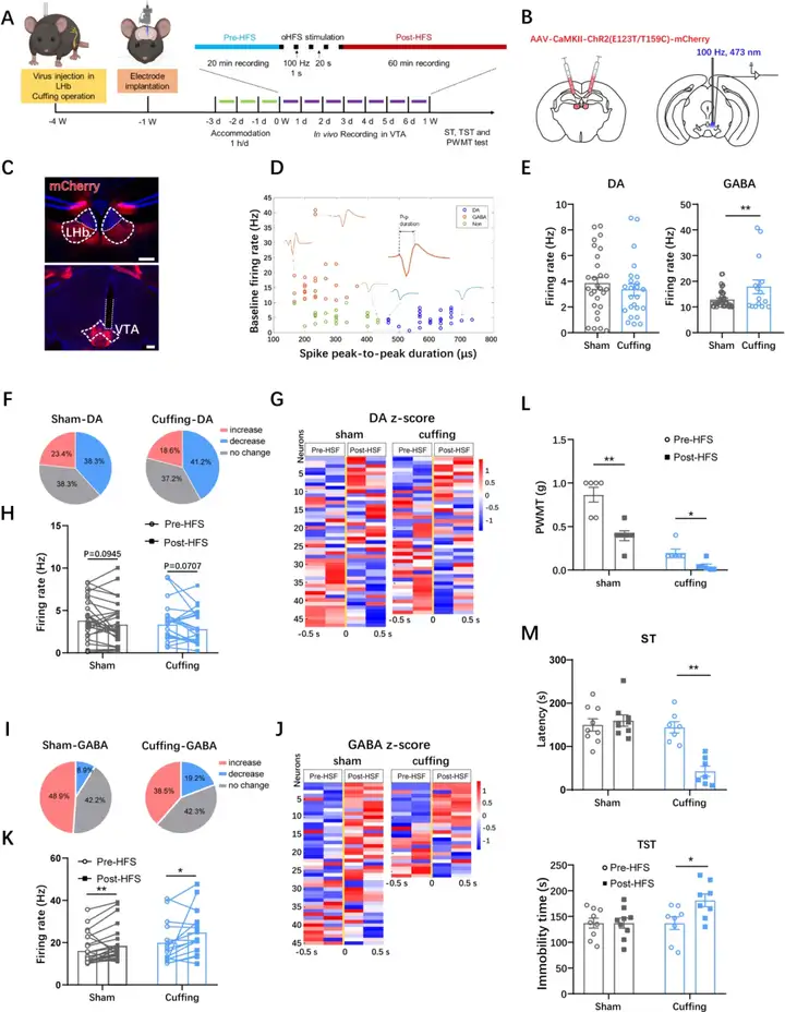 图4. 在体电生理记录显示高频光刺激激活LHb-VTA通路产生抑郁样行为