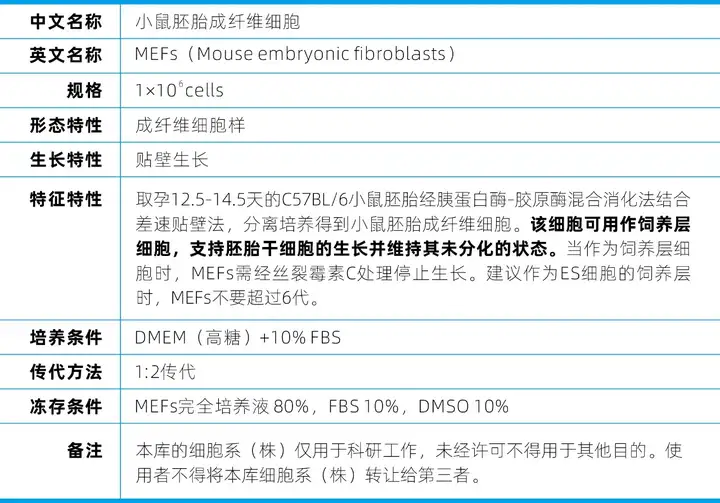 胚胎干细胞(Embryonic stem cells,ESCs,简称ES细胞)在体外极易分化,必须在培养基中加入分化抑制因子或将其培养在能分泌分化抑制因子的饲养层细胞上才能维持培养。因此,对于有饲养层的多能干细胞扩增培养,选用状况良好的饲养层细胞至关重要。小鼠胚胎成纤维细胞(MEFs)是适用于小鼠或人胚胎干细胞(ESCs)及诱导多能干细胞(iPSCs)的饲养层细胞。MEFs能产生抑制ES细胞自主分化和促进ES细胞增殖的因子,能够有效促进ES细胞的增殖并维持其未分化特性和多能性,且分泌效果优于外源添加的一些因子,可以为ES细胞的培养提供类似于体内的微环境,故在研究哺乳动物ES细胞中得到广泛使用。
