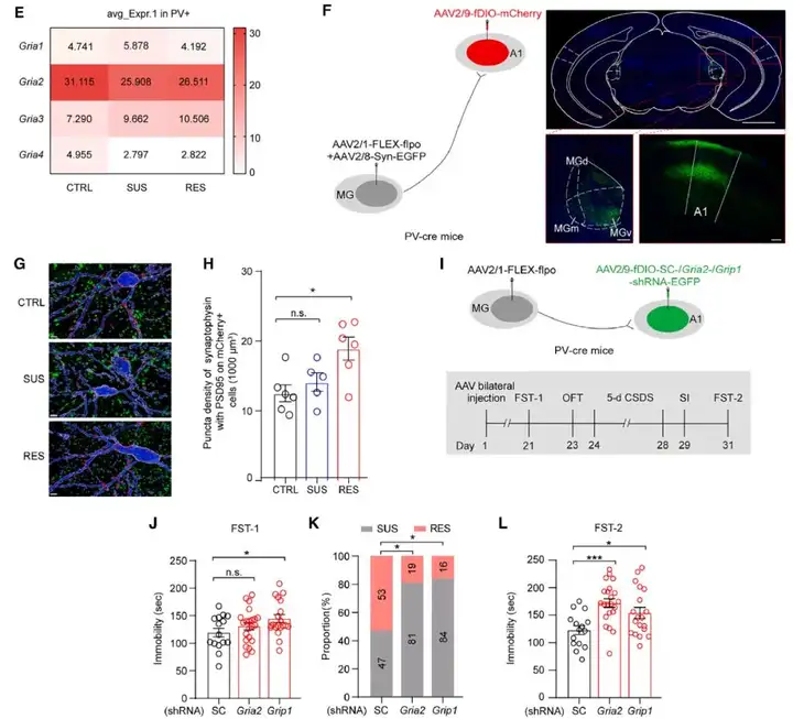 为理解RES小鼠MGPV神经元激活的分子基础,作者对来自10天CSDS范式后的SUS、RES小鼠,对照小鼠A1的细胞进行单核RNA测序(snRNA-seq),迭代聚类分析细胞类型,结果显示AMPA受体亚基GluA2(由Gria2编码)在A1的PV-INs中高表达。因此,研究人员进一步探究CSDS后RES小鼠MGPV神经元兴奋性丘脑输入是否增强,作者在PV-cre小鼠MG注射AAV2/1-FLEX-flpo及表达突触前标记蛋白的rAAV2/8-hSyn-Synaptophysin-EGFP,并在同侧A1注射AAV2/9-fDIO-mCherry,以在MGPV神经元表达mCherry,MGA1神经元表达syn-EGFP,随后小鼠接受10天CSDS范式,结果显示RES小鼠MGPV神经元胞体和树突中syn-EGFP+/PSD95+(突触后标记蛋白,蓝色)斑点(红色箭头指示)的数量和密度明显高于对照组小鼠。这说明CSDS后RES小鼠MGPV神经元的丘脑突触发生增多。谷氨酸受体相互作用蛋白1(GRIP1,由Grip1编码)在突触可塑性过程中对调节AMPA受体运输发挥重要作用。为检测MGPV神经元增强的丘脑输入在介导心理韧性中的作用,作者在PV-cre小鼠双侧A1注射AAV介导的shRNA,同侧MG注射AAV2/1-FLEX-flpo,从而在MGPV神经元敲低Gria2或Grip1表达。病毒注射3周后进行行为学检测,结果显示在第一次FST实验(FST-1)中,Grip1下调明显增加小鼠静止时间。在CSDC范式5d后,相比对照组,Gria2或Grip1表达下调组RES小鼠数量均明显降低,在第二次FST实验(FST-2)中,Gria2和Grip1表达下调组均明显增加小鼠静止时间。综合来看,这些结果清楚地表明MGPV神经元的丘脑突触发生促进CSDS后小鼠的心理韧性。