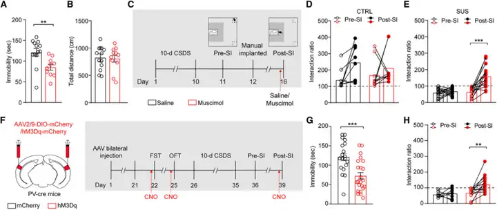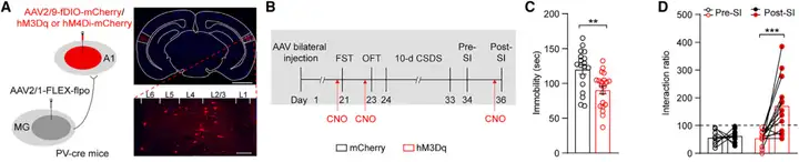 为确定A1中的PV-INs激活是否产生抗抑郁样作用,作者在小鼠双侧A1中注射毒蝇蕈.醇(A型γ-氨基丁.酸受体激动剂)模拟PV-INs的激活,结果表示与注射生理盐水的对照组相比,注射毒蝇蕈.醇小鼠在强迫游泳实验(FST)中静止时间明显减少且不影响旷场实验(OFT)中的自主运动能力。小鼠经历10-d CSDS后在双侧A1中注射毒蝇蕈.醇前后分别进行社交互动实验,结果表明双侧A1注射毒蝇蕈.醇逆转了由CSDS范式诱导的SUS小鼠的社交回避行为,而A1注射毒蝇蕈.醇对对照组小鼠社交行为没有影响。随后在成年PV-cre小鼠双侧A1注射AAV2/9-DIO-hM3Dq-mCherry激活PV-INs,结果显示3周后实验组(表达hM3Dq)在CNO注射后小鼠在FST的静止时间明显减少,三天后再次注射CNO也不影响OFT中的自主运动能力。OFT后所有小鼠均进行10-d CSDS范式,且SUS小鼠注射CNO,结果显示相比注射前,hM3Dq-SUS小鼠在CNO注射后社交互动时间更长。而mCherry-SUS小鼠在CNO注射后社交互动比率没改变。