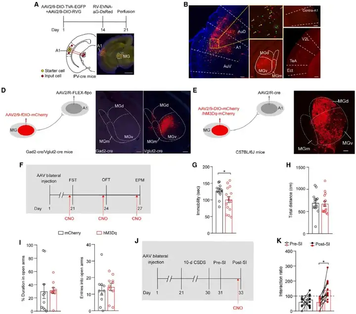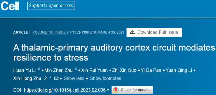 2023年3月30日,南方医科大学基础医学院朱心红教授团队在Cell期刊发表题为“A thalamic-primary auditory cortex circuit mediates resilience to stress”的研究论文。本文中,作者证实来自同侧内侧膝状体(MG)的丘脑输入激活初级听觉皮层(A1)中的小清蛋白(PV)中间神经元(PV-INs)对暴露于慢性社交挫败应激(CSDS)小鼠的心理韧性至关重要。本研究发现丘脑-初级听觉皮层环路介导心理韧性的产生。