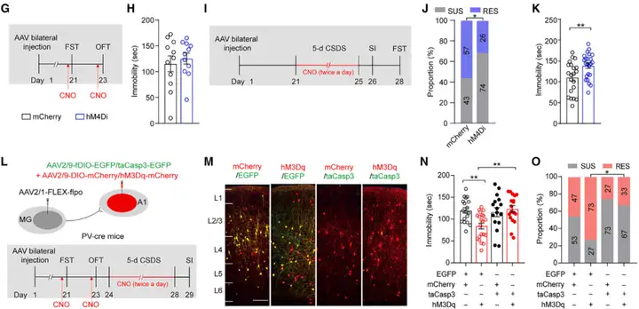 为确定MGPV神经元激活对于心理韧性产生是否是必要的,作者将AAV2/9-fDIO-hM4Di-mCherry或对照AAV2/9-fDIO-mCherry双侧注射到PV-cre小鼠的A1中,将AAV2/1-FLEX-flpo注射到MG中,随后进行行为测试。结果表示在FST中,CNO注射(化学遗传学抑制MGPV神经元)对静止时间几乎没有影响(无应激时)。而小鼠在AAV双侧注射3周后接受5天CSDS范式期间,每天注射两次CNO,结果显示CNO注射后hM4Di小鼠表现为易感型的比例升高。此外,在FST中,与对照小鼠比较,hM4Di小鼠静止时间显著增加。综上所述,这些数据证实MGPV神经元激活在暴露于应激期间促进心理韧性的功能重要性。更进一步地,研究人员在PV-cre小鼠A1中注射AAV2/9-fDIO-taCasp3-TEVp-P2A-EGFP(taCasp3诱导神经元凋亡)及对照、AAV2/9-DIO-hM3Dq-mCherry及对照,MG中注射AAV2/1-FLEX-flpo,从而选择性杀死MGPV神经元同时激活其他PV-INs。结果表示,激活A1中的PV-INs诱导的抗抑郁样作用被MGPV神经元的缺失所阻断(单独激活PV-INs与激活PV-INs同时杀死MGPV神经元对比),而单独缺失MGPV神经元对FST中静止时间几乎没有影响。此外,上述AAV注射后小鼠进行5-d CSDS范式,CNO每天注射两次,结果表示,相比于单独激活PV-INs,激活PV-INs同时缺失MGPV神经元小鼠表现为抗性型的比例明显降低(即逆转RES小鼠的增加)。表明激活A1中的PV-INs在5-d CSDS范式中诱导的抗抑郁样作用也被MGPV神经元的缺失所阻断。总的来说,这些结果清楚地表明MGPV神经元的激活对于小鼠应对慢性应激的心理韧性至关重要。