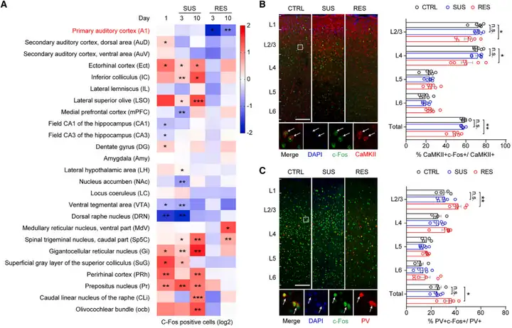 本研究中作者发现初级听觉区域参与的微环路介导心理韧性的形成,为未来神经调控治疗抑郁症提供了新的策略和靶点。